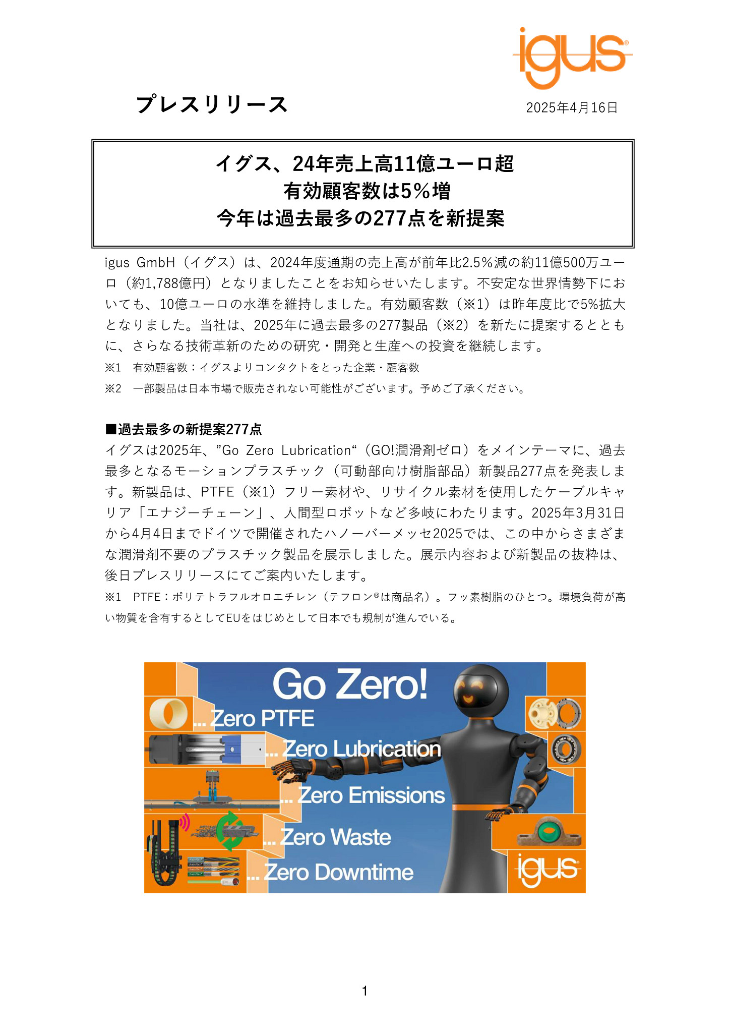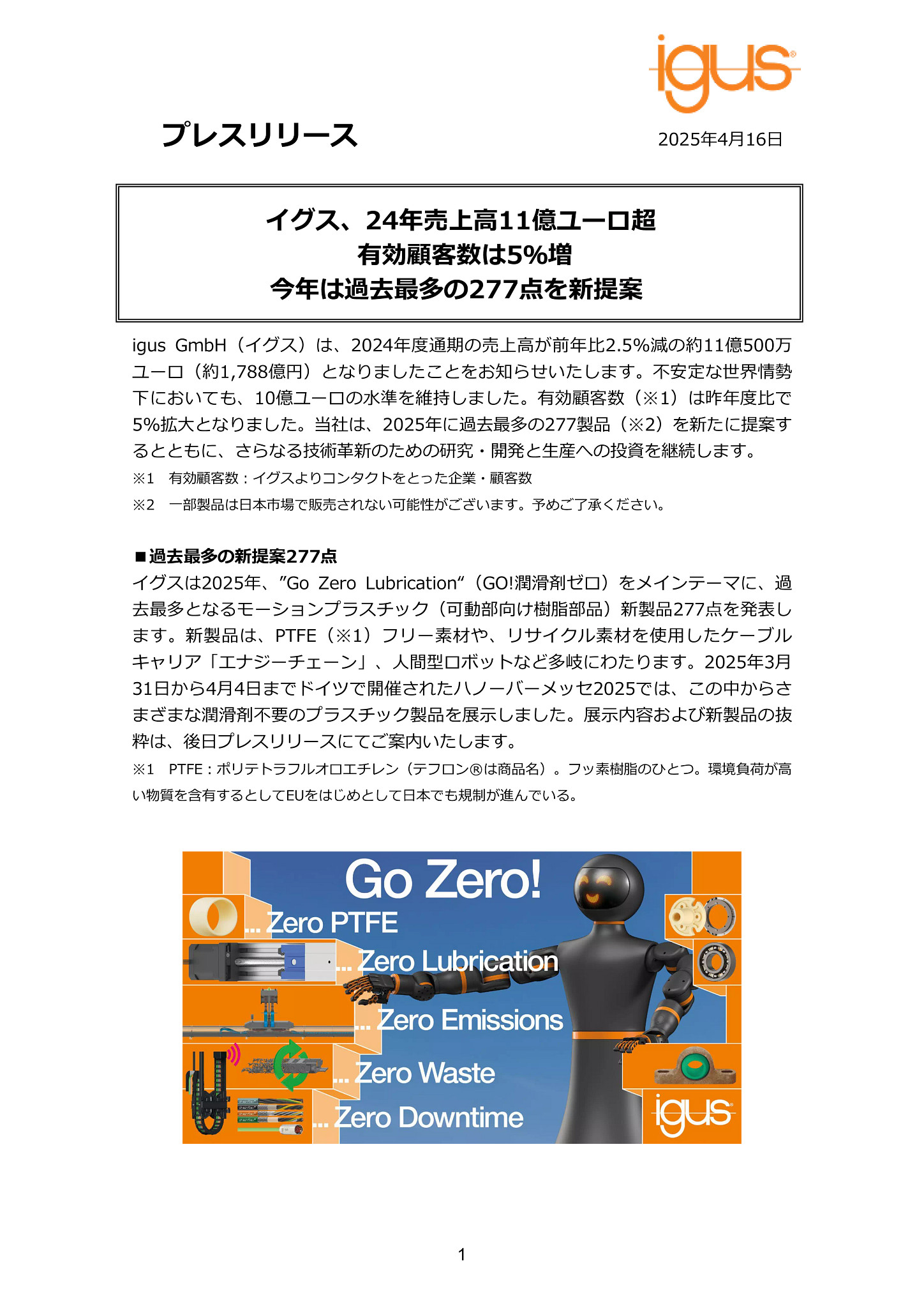 igus GmbH(イグス)は、2024年度通期の売上高が前年比2.5%減の約11億500万ユーロ(約1,788億円)となりましたことをお知らせいたします。不安定な世界情勢下においても、10億ユーロの水準を維持しました。有効顧客数(※1)は昨年度比で5%拡大となりました。当社は、2025年に過去最多の277製品(※2)を新たに提案するとともに、さらなる技術革新のための研究・開発と生産への投資を継続します。