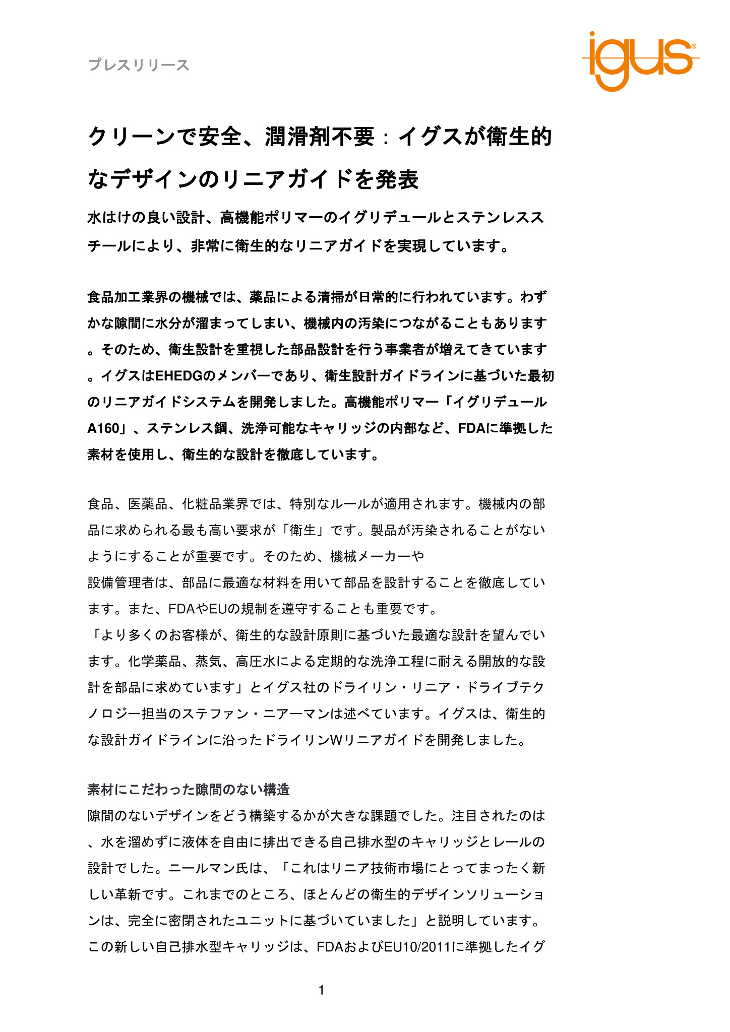 食品、医薬品、化粧品業界では、特別なルールが適用されます。機械内の部品に求められる最も高い要求が「衛生」です。製品が汚染されることがないようにすることが重要です。そのため、機械メーカーや 設備管理者は、部品に最適な材料を用いて部品を設計することを徹底しています。また、FDAやEUの規制を遵守することも重要です。 「より多くのお客様が、衛生的な設計原則に基づいた最適な設計を望んでいます。化学薬品、蒸気、高圧水による定期的な洗浄工程に耐える開放的な設計を部品に求めています」とイグス社のドライリン・リニア・ドライブテクノロジー担当のステファン・ニアーマンは述べています。イグスは、衛生的な設計ガイドラインに沿ったドライリンWリニアガイドを開発しました。
