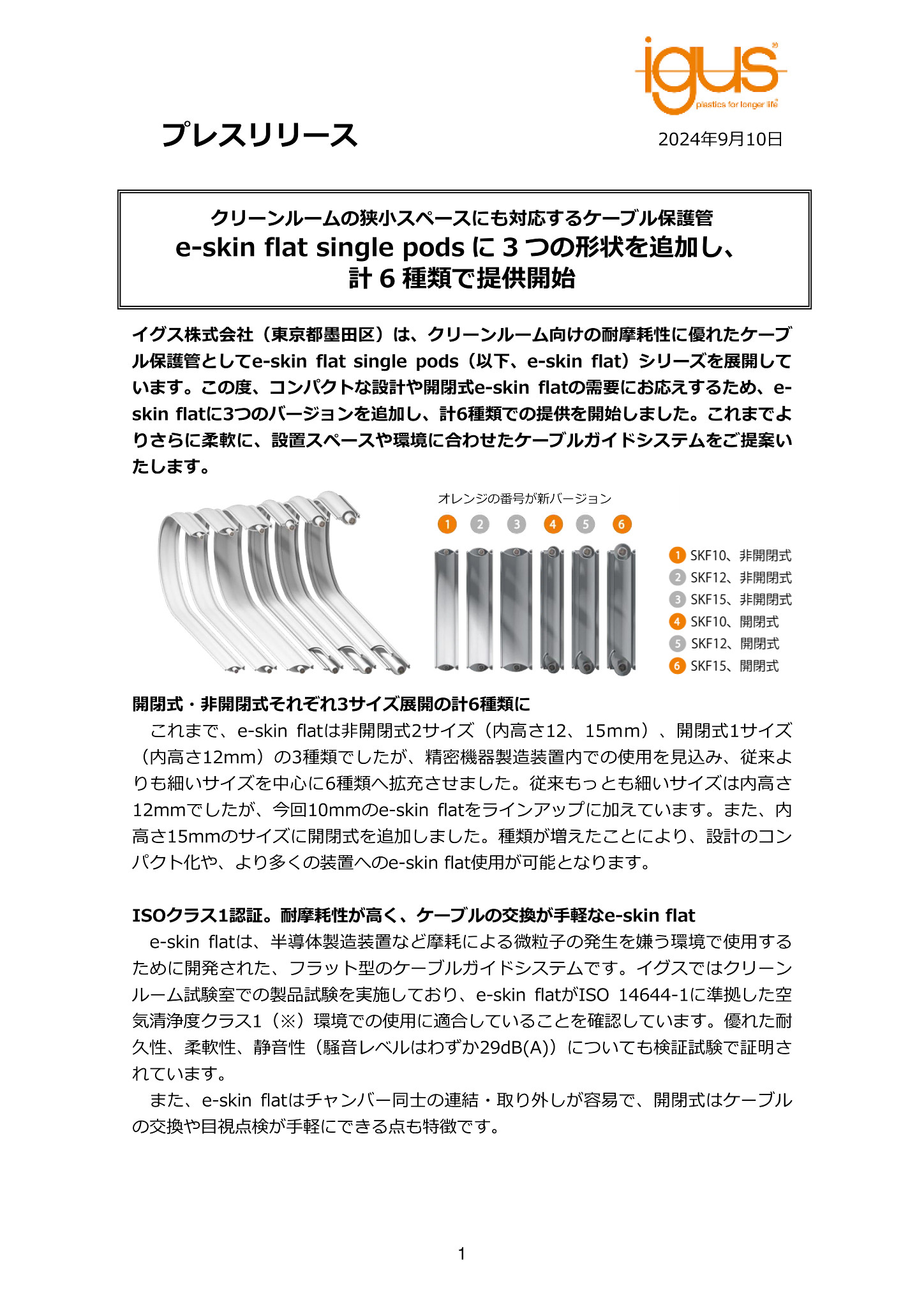 イグス株式会社(東京都墨田区)は、クリーンルーム向けの耐摩耗性に優れたケーブル保護管としてe-skin flat single pods(以下、e-skin flat)シリーズを展開しています。この度、コンパクトな設計や開閉式e-skin flatの需要にお応えするため、e-skin flatに3つのバージョンを追加し、計6種類での提供を開始しました。これまでよりさらに柔軟に、設置スペースや環境に合わせたケーブルガイドシステムをご提案いたします。