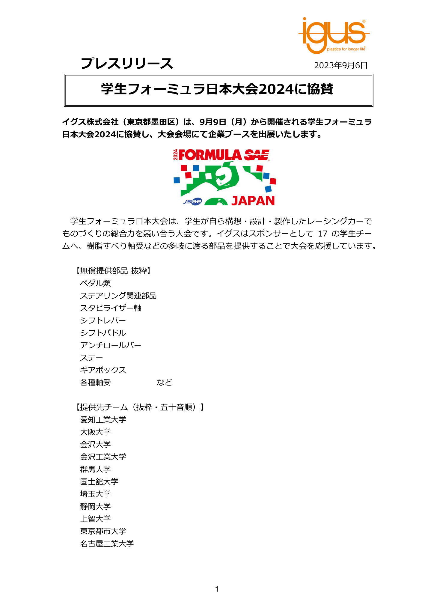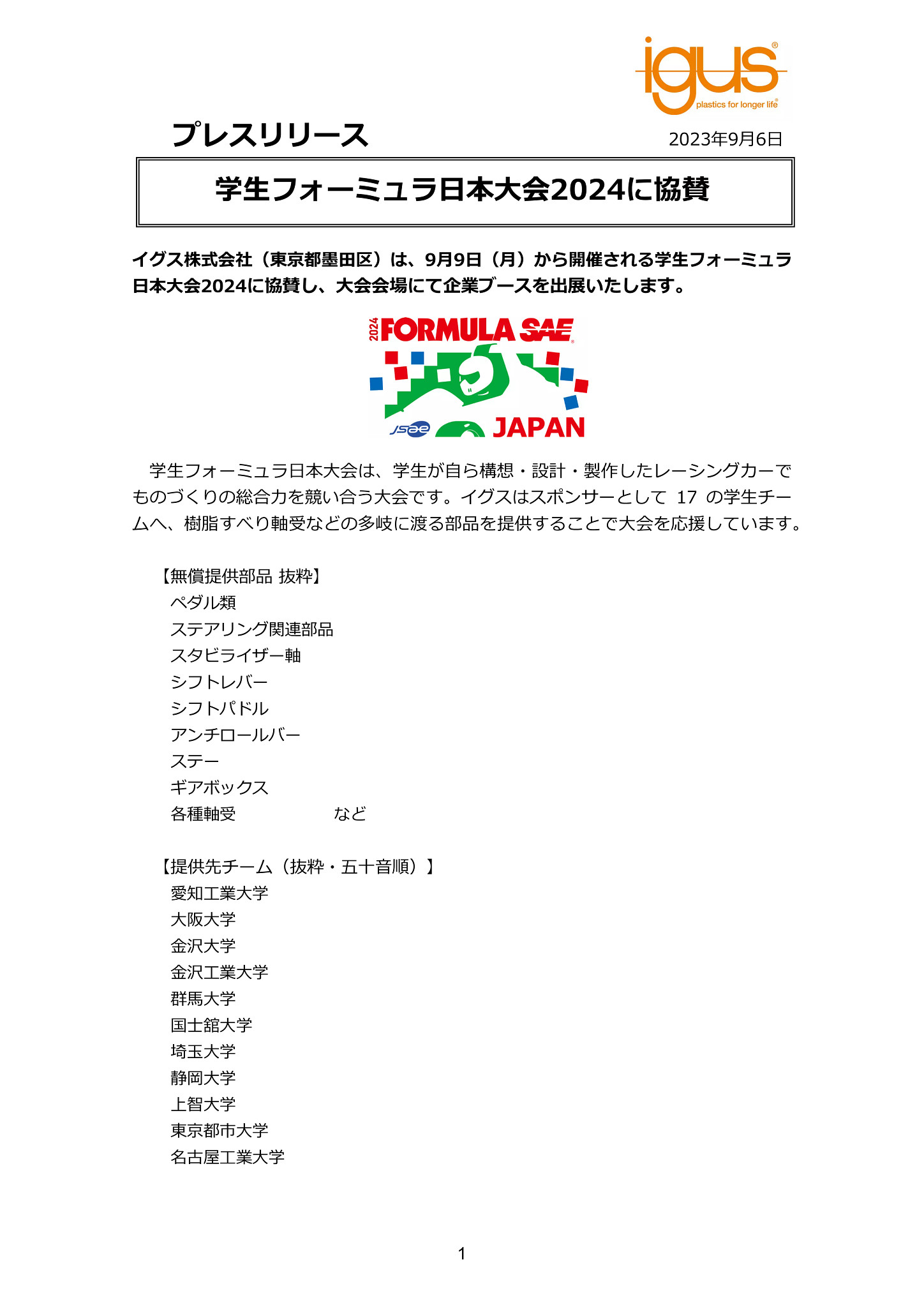 イグス株式会社(東京都墨田区)は、9月9日(月)から開催される学生フォーミュラ日本大会2024に協賛し、大会会場にて企業ブースを出展いたします。