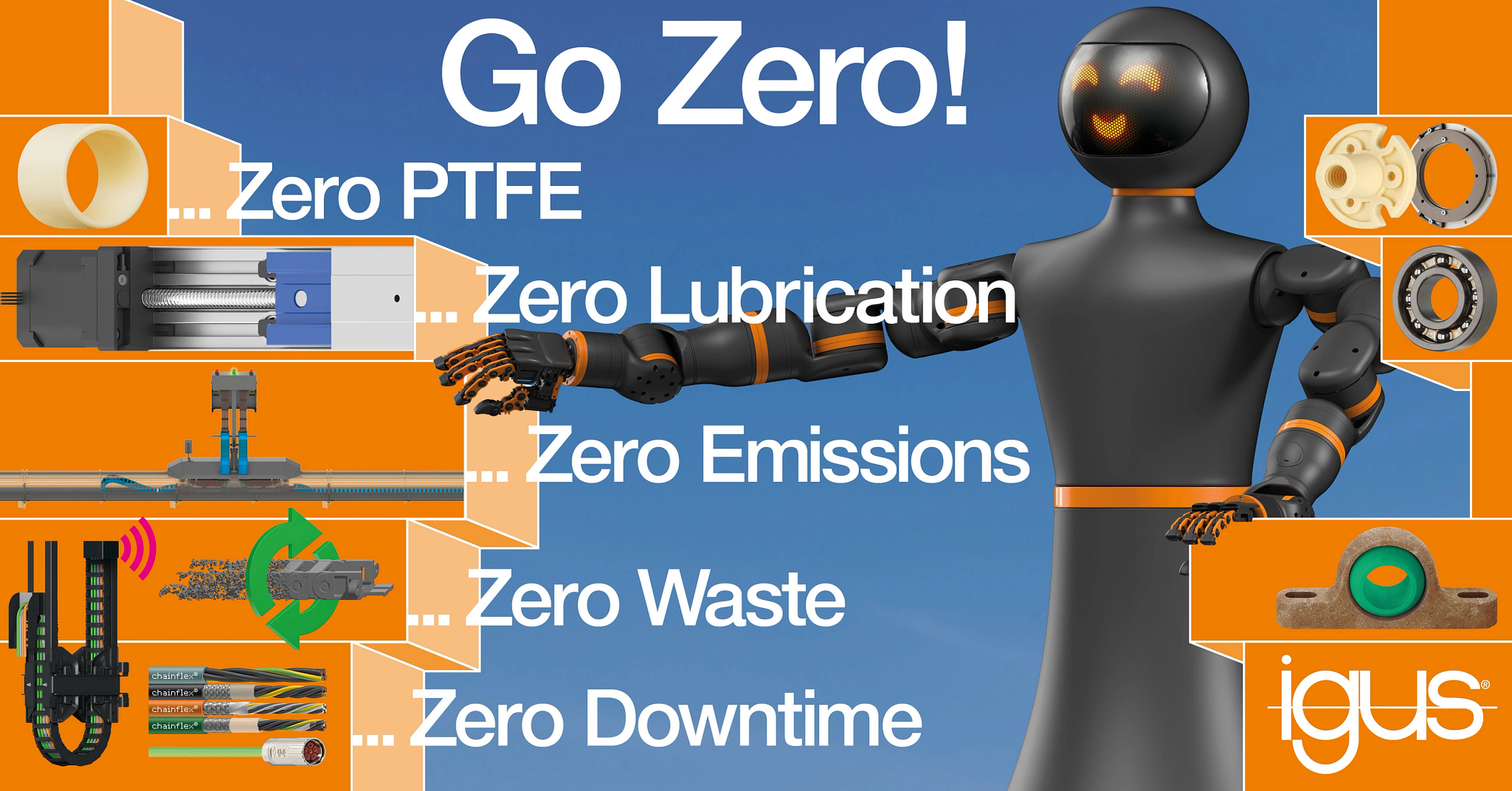 イグスは2025年、”Go Zero Lubrication“(GO!潤滑剤ゼロ)をメインテーマに、過去最多となるモーションプラスチック(可動部向け樹脂部品)新製品277点を発表します。新製品は、PTFE(※1)フリー素材や、リサイクル素材を使用したケーブルキャリア「エナジーチェーン」、人間型ロボットなど多岐にわたります。2025年3月31日から4月4日までドイツで開催されたハノーバーメッセ2025では、この中からさまざまな潤滑剤不要のプラスチック製品を展示しました。展示内容および新製品の抜粋は、後日プレスリリースにてご案内いたします。
