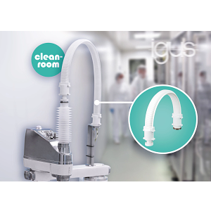 電子部品や半導体、ディスプレイを製造するような環境では、機械が動作する際の摩耗から生まれる微細な粒子が製品破損の原因になり得ます。特にスカラロボットを使用する場合は、4軸でサイクルタイムが1秒以下の高速作業を行うため、材質に応力がかかり粒子の剥離が起きやすくなります。そのためイグスでは、スカラロボットに取り付けるケーブルやホースをガイドするエネルギー供給システムとして、クリーンルーム専用タイプ『スカラケーブルソリューション(以下SCS)』を追加しました。