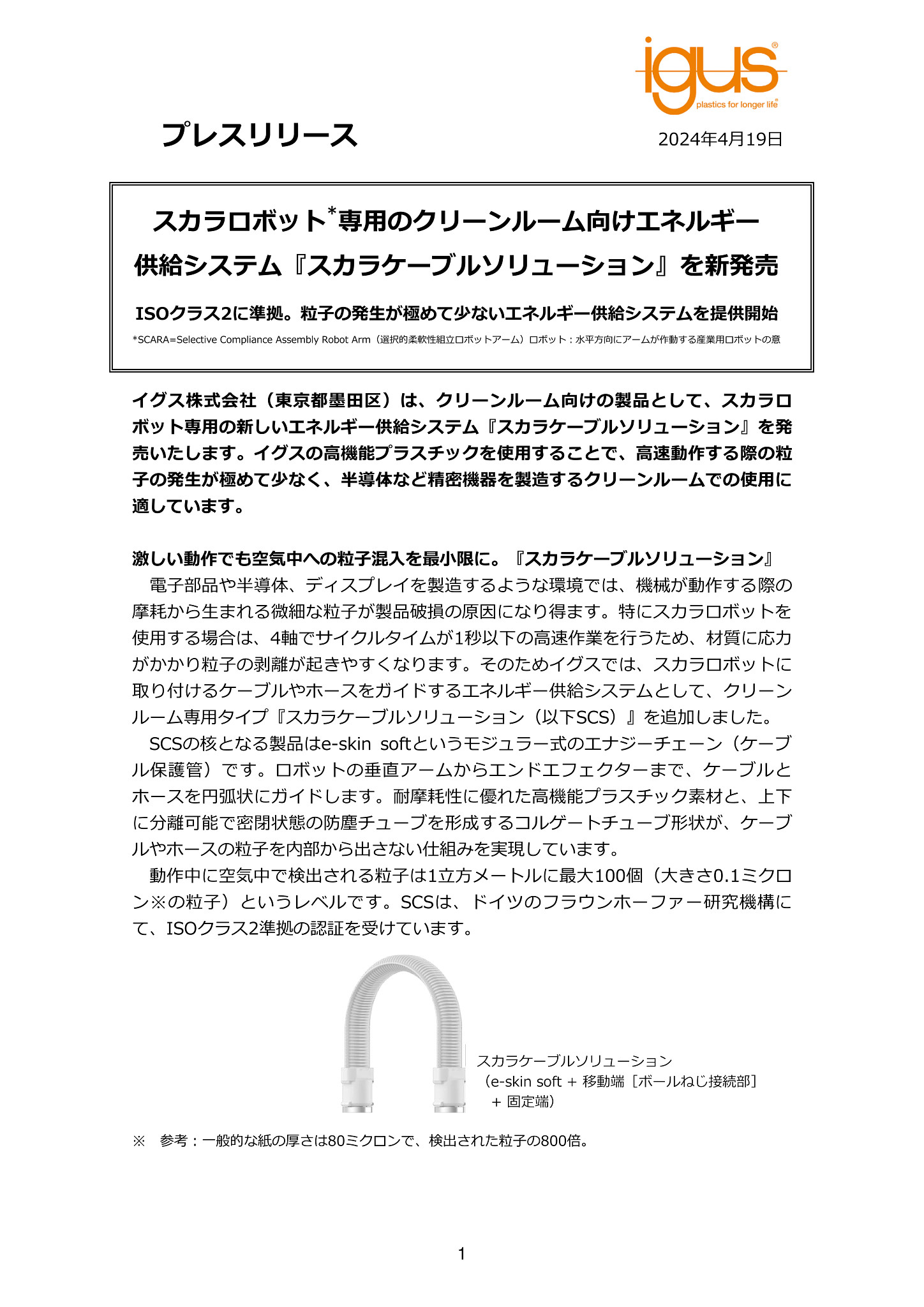 イグス株式会社(東京都墨田区)は、クリーンルーム向けの製品として、スカラロボット専用の新しいエネルギー供給システム『スカラケーブルソリューション』を発売いたします。イグスの高機能プラスチックを使用することで、高速動作する際の粒子の発生が極めて少なく、半導体など精密機器を製造するクリーンルームでの使用に適しています。