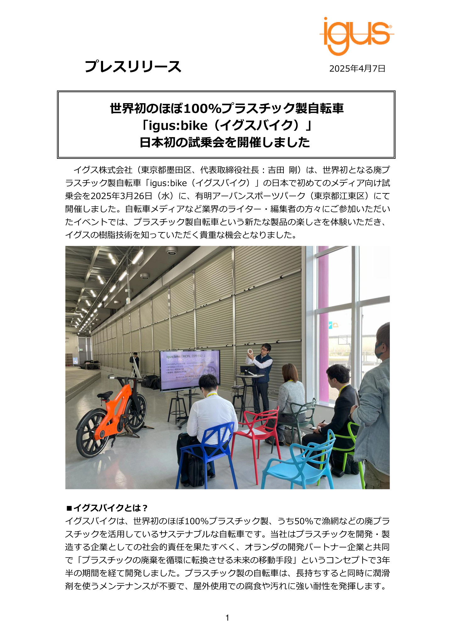 イグス株式会社(東京都墨田区、代表取締役社長:吉田 剛)は、世界初となる廃プラスチック製自転車「igus:bike(イグスバイク)」の日本で初めてのメディア向け試乗会を2025年3月26日(水)に、有明アーバンスポーツパーク(東京都江東区)にて開催しました。自転車メディアなど業界のライター・編集者の方々にご参加いただいたイベントでは、プラスチック製自転車という新たな製品の楽しさを体験いただき、イグスの樹脂技術を知っていただく貴重な機会となりました。
