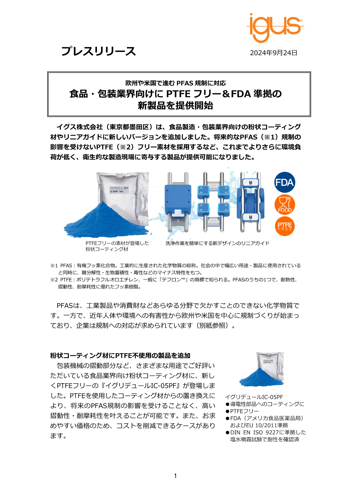 イグス株式会社(東京都墨田区)は、食品製造・包装業界向けの粉状コーティング材やリニアガイドに新しいバージョンを追加しました。将来的なPFAS(※1)規制の影響を受けないPTFE(※2)フリー素材を採用するなど、これまでよりさらに環境負荷が低く、衛生的な製造現場に寄与する製品が提供可能になりました。