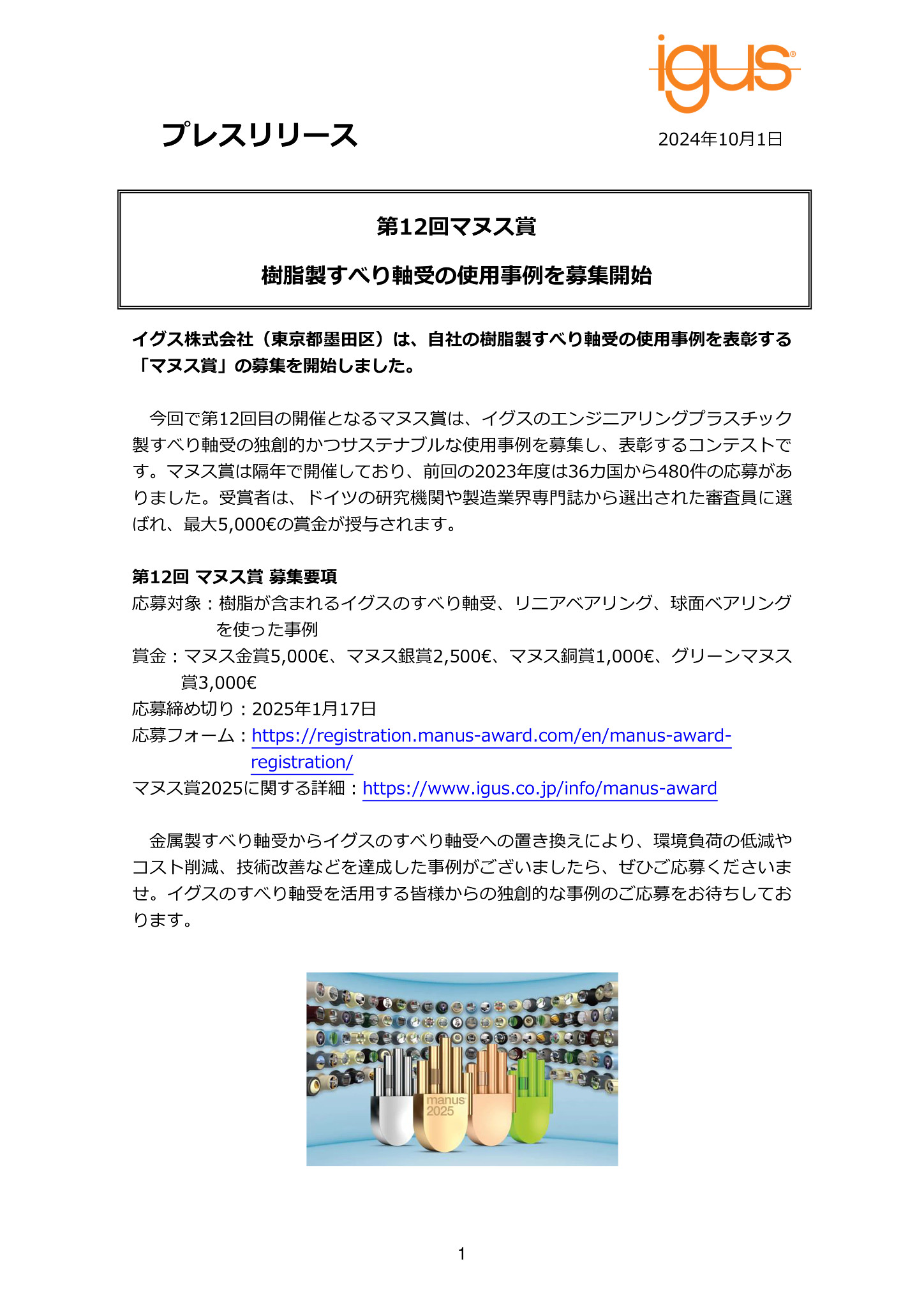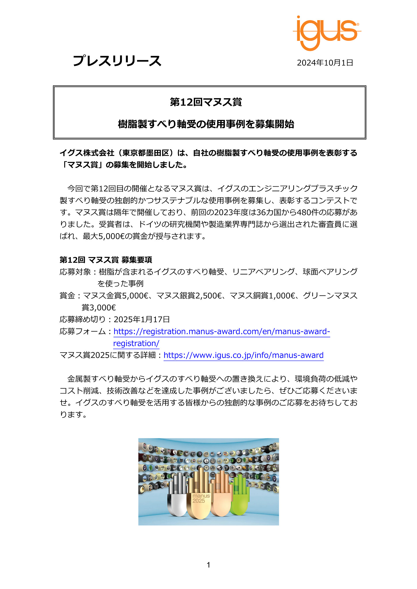 イグス株式会社(東京都墨田区)は、自社の樹脂製すべり軸受の使用事例を表彰する「マヌス賞」の募集を開始しました。