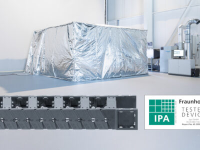 イグスは、最高の衛生基準が要求される場合、無潤滑で耐摩耗性に優れたプラスチック製の可動部品で高い評価を得ています。特に、自動車に搭載される電池の生産には、特殊な環境条件が必要であり、ドライルームとクリーンルームの組み合わせで実現されています。フラウンホーファーIPAは、まさにこのような要件に対応した新しいタイプの証明書を開発しました。 イグスのE6.29エナジーチェーンは、ドライクリーンルーム条件下でテストされ、ISOクラス4の認定を受けた最初のケーブルガイドシステムです。
