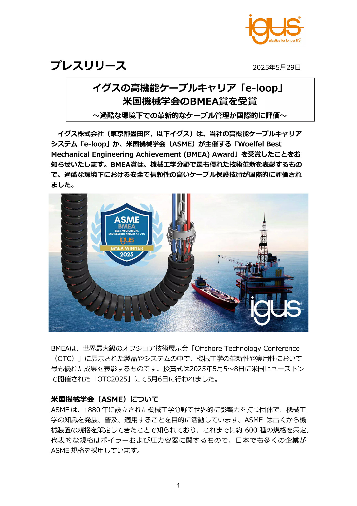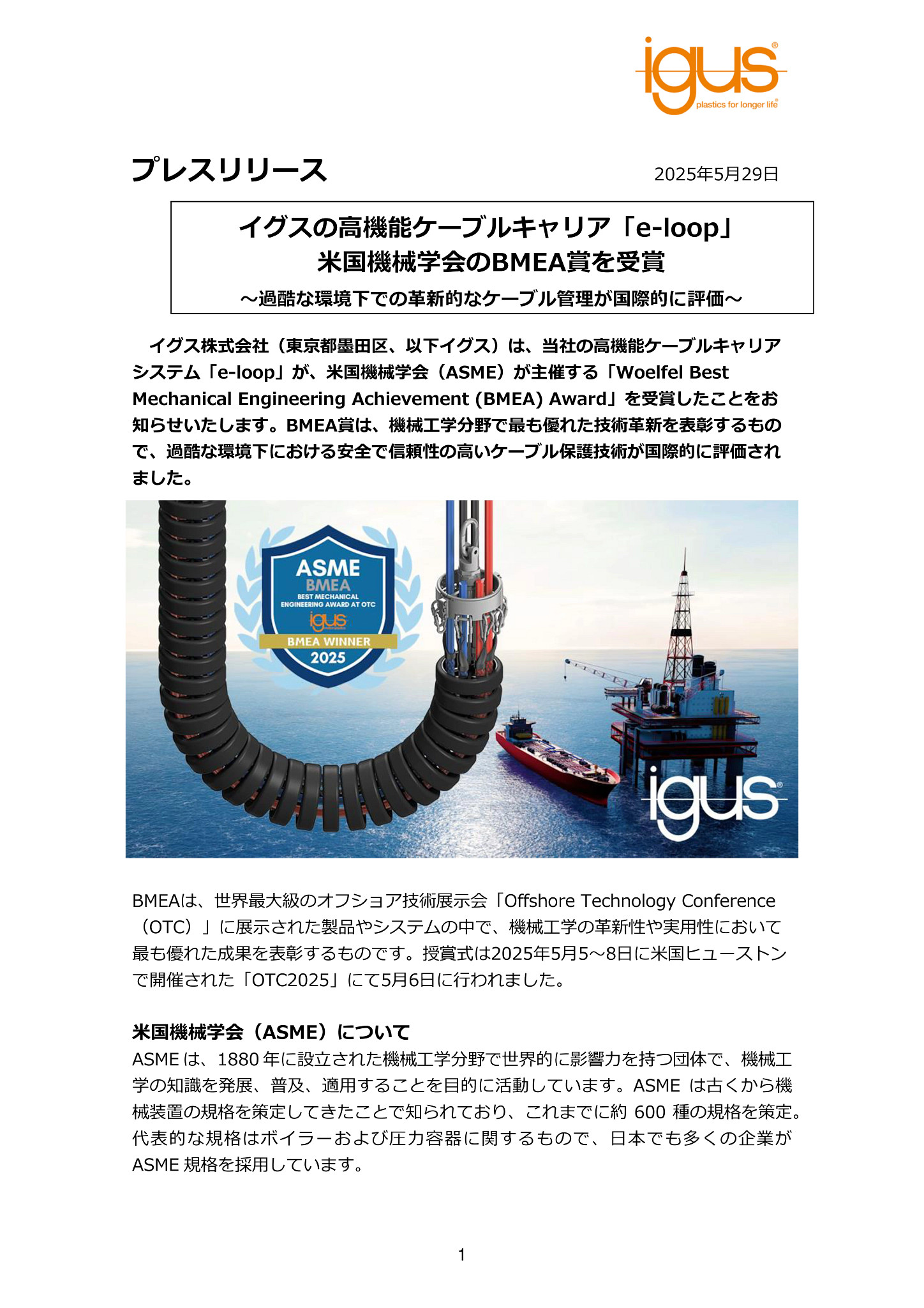 イグス株式会社(東京都墨田区、以下イグス)は、当社の高機能ケーブルキャリアシステム「e-loop」が、米国機械学会(ASME)が主催する「Woelfel Best Mechanical Engineering Achievement (BMEA) Award」を受賞したことをお知らせいたします。BMEA賞は、機械工学分野で最も優れた技術革新を表彰するもので、過酷な環境下における安全で信頼性の高いケーブル保護技術が国際的に評価されました。