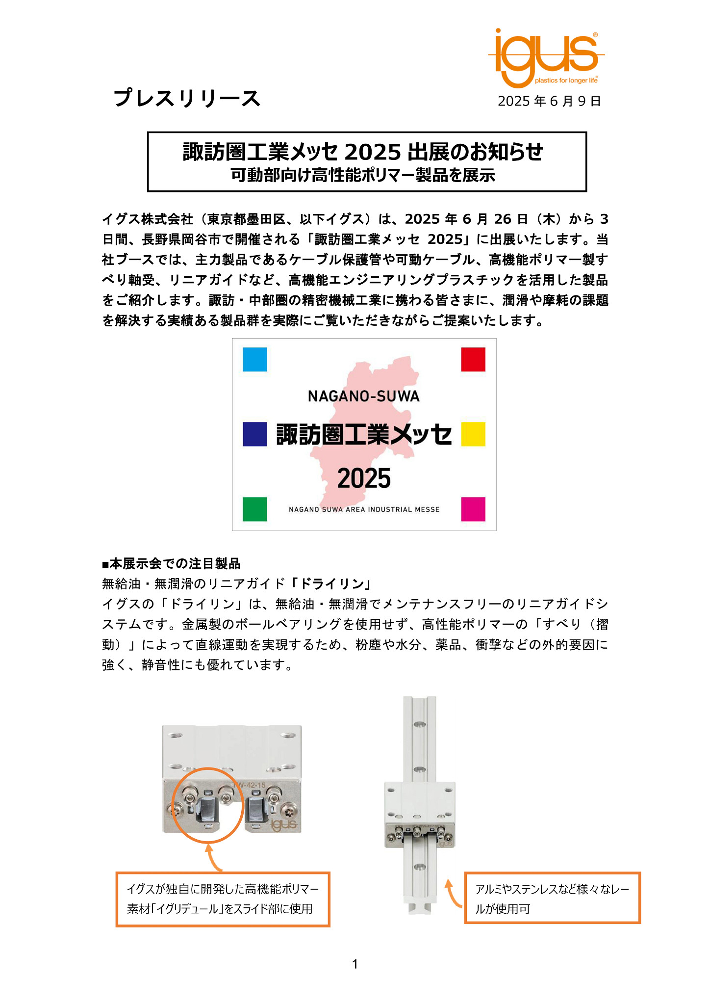 イグス株式会社(東京都墨田区、以下イグス)は、2025年6月26日(木)から3日間、長野県岡谷市で開催される「諏訪圏工業メッセ2025」に出展いたします。当社ブースでは、主力製品であるケーブル保護管や可動ケーブル、高機能ポリマー製すべり軸受、リニアガイドなど、高機能エンジニアリングプラスチックを活用した製品をご紹介します。諏訪・中部圏の精密機械工業に携わる皆さまに、潤滑や摩耗の課題を解決する実績ある製品群を実際にご覧いただきながらご提案いたします。