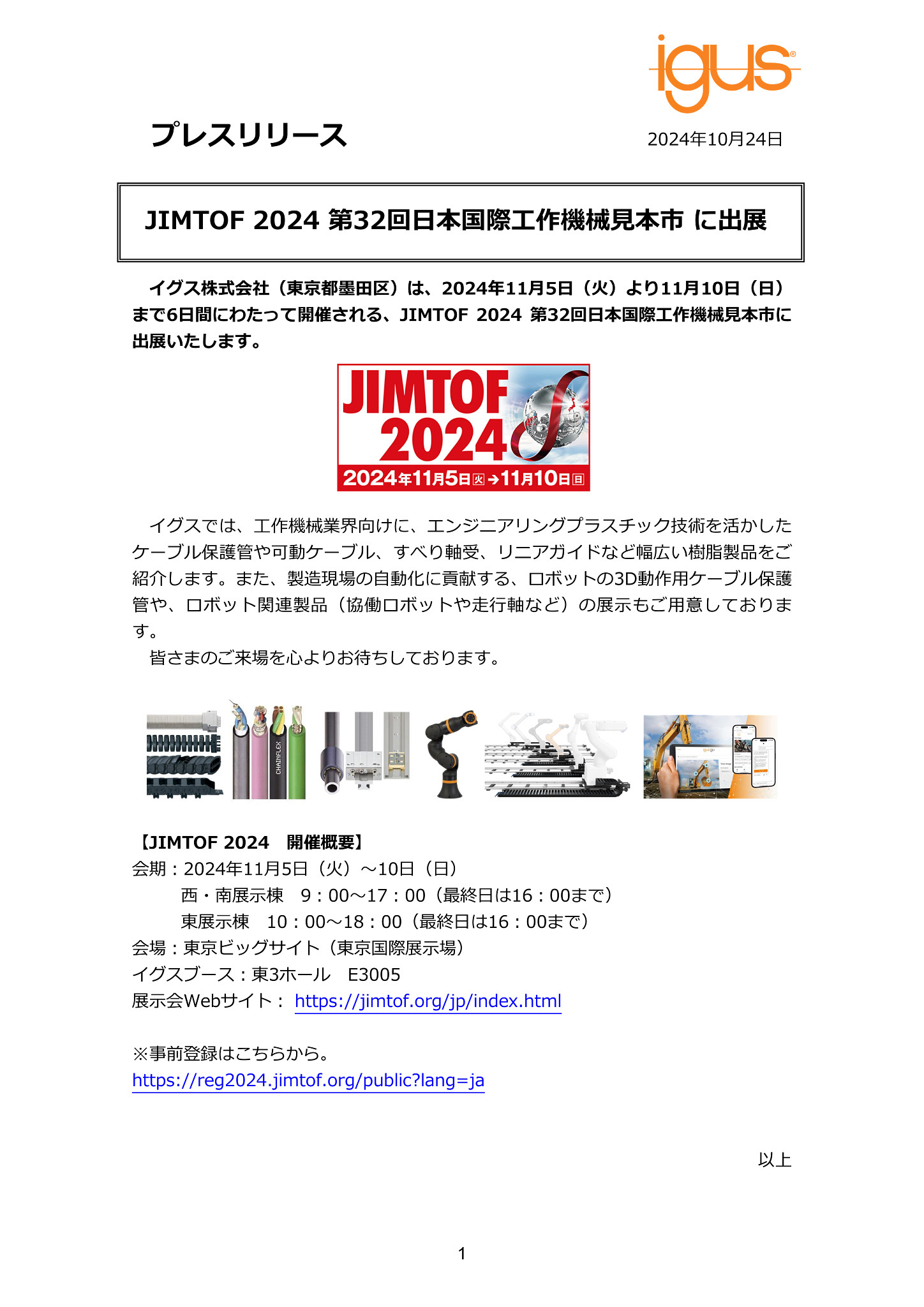 イグス株式会社(東京都墨田区)は、2024年11月5日(火)より11月10日(日)まで6日間にわたって開催される、JIMTOF 2024 第32回日本国際工作機械見本市に出展いたします。