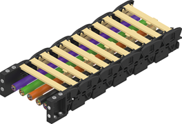 クリーンルーム向けのケーブル保護管「エナジーチェーンC6」は、サイドパーツが標準で静電気放電(ESD)仕様なので、静電気が生じる環境でも使用可能。クロスバーや内部仕切りに滑りの良い材質「イグリデュールJ」を使用することで、ケーブル・ホースの摩耗を軽減します。