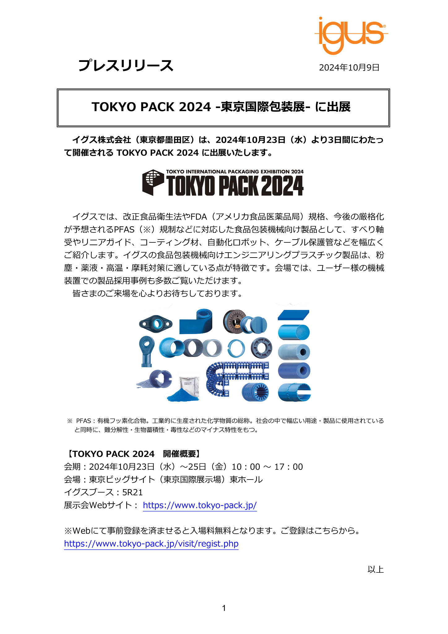イグス株式会社(東京都墨田区)は、2024年10月23日(水)より3日間にわたって開催される TOKYO PACK 2024 に出展いたします。